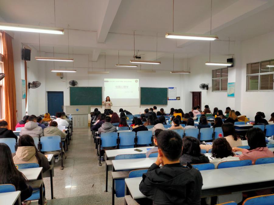陈聪老师从绘画心理的概念、类型、用途以及分析方法等方面对绘画心理学进行了绘声绘色的讲述,并穿插了体验活动让同学们体会到绘画心理学的神奇之处。同学们听得津津有味,课堂气氛很活跃,充满了欢声笑语。绘画心理的有关内容讲解结束后,陈聪又以心理机构负责人和心理咨询师的身份,就同学们提出的关于心理咨询行业未来发展问题进行了耐心的解答。