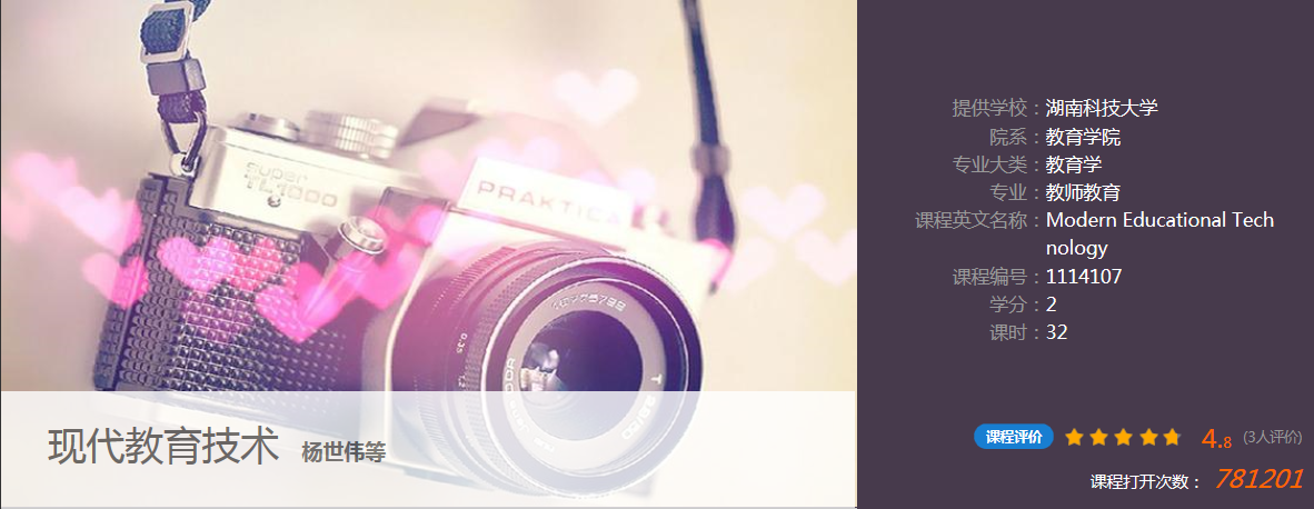 2018年5月,《现代教育技术》经过申报被立项成为校级精品开放在线课程,从2018年6月到2019年6月,课程团队对原教材(现代教育技术,湘潭大学出版社,2012版)进行了大幅度的修改后,于2019年8月在湖南人民出版社出版了版教材,在编写新版教材时,团队注意到了文字教材与MOOC建设的配合,并正式开始设计与建设MOOC课程。