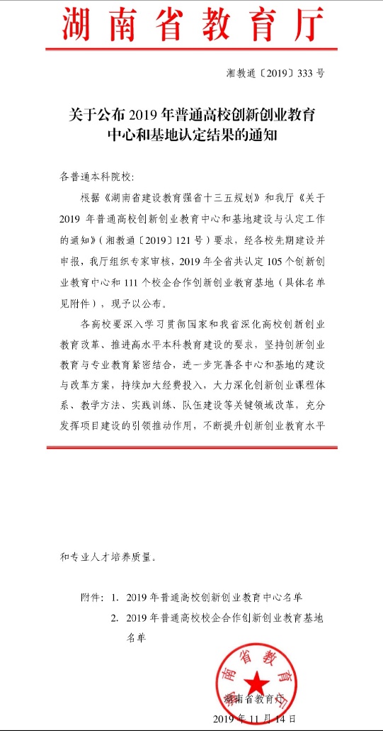 近日,湖南省教育厅发布了《关于公布2019年普通高校创新创业教育中心和基地认定结果的通知》(湘教通〔2019〕333号)。我院申报的“‘人工智能+’师范生创新创业教育中心”入选省教育厅2019年普通高校创新创业教育中心建设名单。
