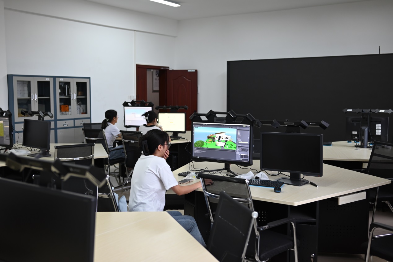 您所在的位置: 首页» 本科教育» 实验教学» 场地与设备 虚拟现实教育应用实训室简介 时间:2023-10-23 14:50:00 虚拟现实教育应用实训室搭建了3D虚拟现实教学大屏、桌面三维交互一体机、6dof头戴式一体机、MR头盔等硬件设备及相关软件,学生可通过这些教学设备,沉浸漫游,体验3D/VR/MR等虚拟场景。老师通过VR内容创作软件可自由创作课件,并通过3D虚拟现实教学大屏进行展示、交互,学生可通过VR头盔进行交互操作,沉浸式教学。 老师们通过电脑技术,将虚拟的信息应用到真实世界,两种信息相互补充、叠加,并同时存在于教室中,帮助学生更立体地理解和掌握知识与技能。