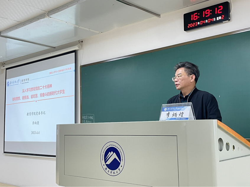 4月4日下午,教育学院2023上半年入党积极分子培训班在敏行楼C412会议室举行。全体学员认真听取了院党委书记李炳煌为入党积极分子讲授的“深入学习贯彻党的二十大精神,做有理想、敢担当、能吃苦、肯奋斗的新时代大学生”主题党课。