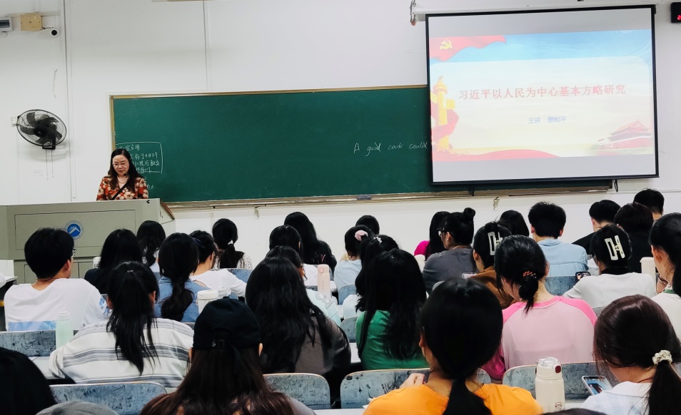 廖和平教授首先以“什么是‘为人民服务’”切入点,解读新征程的九个必须,结合历年党的主要会议报告,深入讲解人民至上的思想及其现实要求。从习近平以人民为中心基本方略的形成条件、基本特征、主要内容和重要意义四个方面进行阐释。她指出:党的根基在人民、血脉在人民、力量在人民;在新时代,进一步探讨人民至上的科学内涵以及弘扬为人民服务的精神是现实所需。