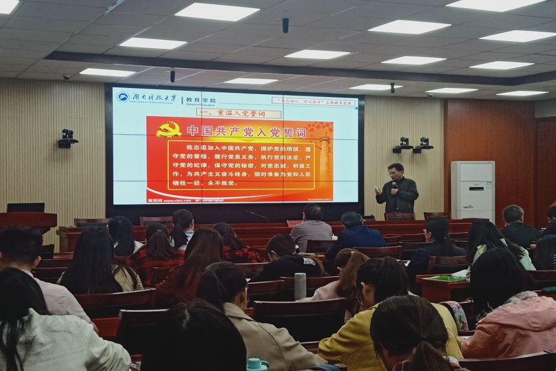 10月22日14:00,教育学院党委书记李炳煌主讲为全院教师党员及学生党员讲了一堂生动的主题教育党课。