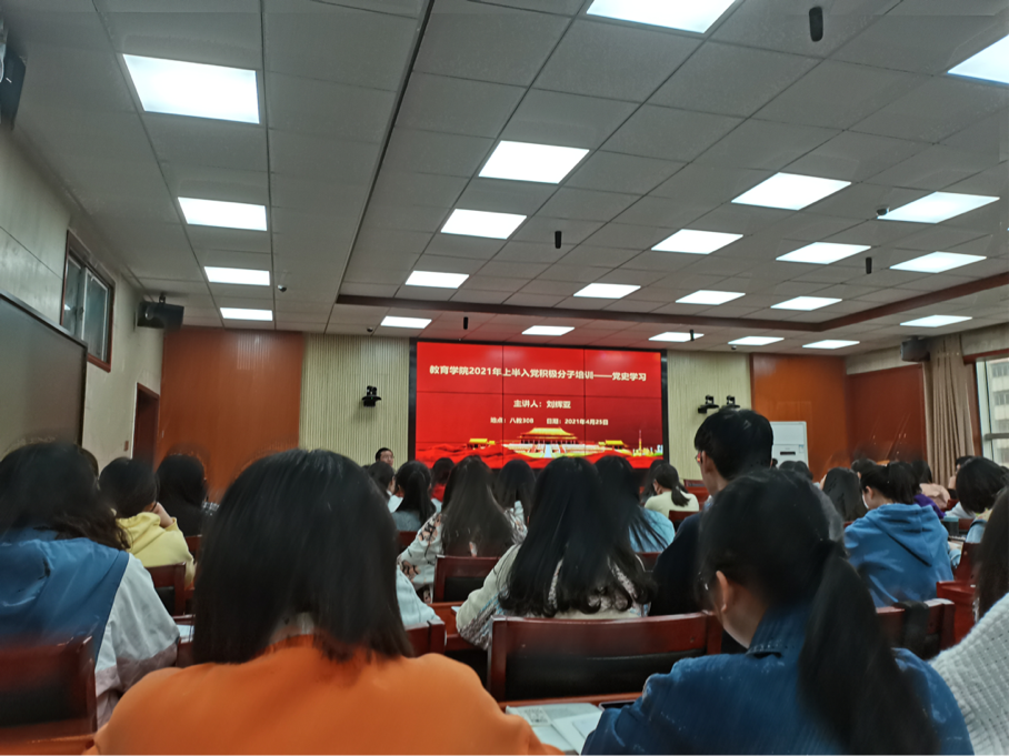 4月25日15:00,教育学院2021上半年入党积极分子培训班在第八教学楼308学术报告厅举行首次党课学习,全体学员认真听取了院党委副书记刘辉亚为入党积极分子讲授的“党史学习”主题党课。