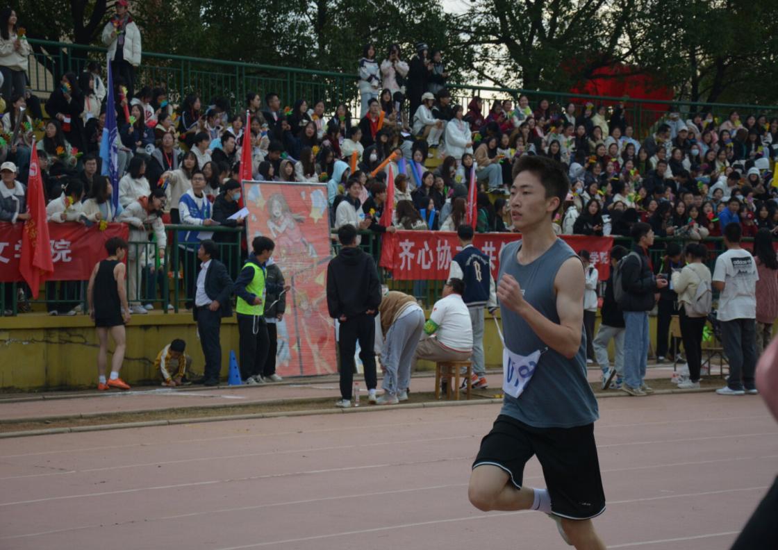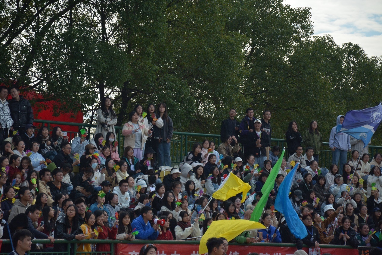 秋日暖阳,赛场上运动健儿们热血澎湃,观众席上的同学们为其激情喝彩。笑声、掌声、欢呼声此起彼伏,奏出运动之歌激情昂扬的音符。