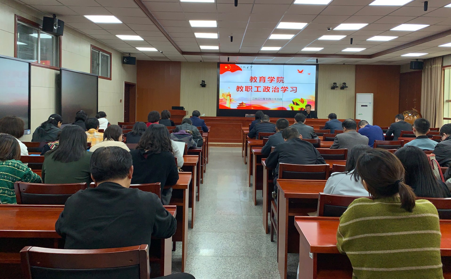 您所在的位置: 首页» 党建工作» 理论学习 教育学院组织教职工政治学习 时间:2021-10-28 09:19:26 10月26日下午,教育学院在八教308会议室组织全院教职工政治学习。本次为校史、院史专题学习教育。院党委书记李炳煌主持学习。 与会人员认真学习湖南科技大学校史、湖南科技大学各学院院史院情、《湖南科技大学“师德师风建设年”推进方案》、学唱《湖南科技大学校歌》。李炳煌强调要加强研究,充分发挥校史、院史的育人功能,更加聚焦大学文化建设,进一步弘扬“唯实惟新,至诚致志”的校训精神;持续推进“师德师风建设年”,努力营造争做人民满意教师的良好氛围。