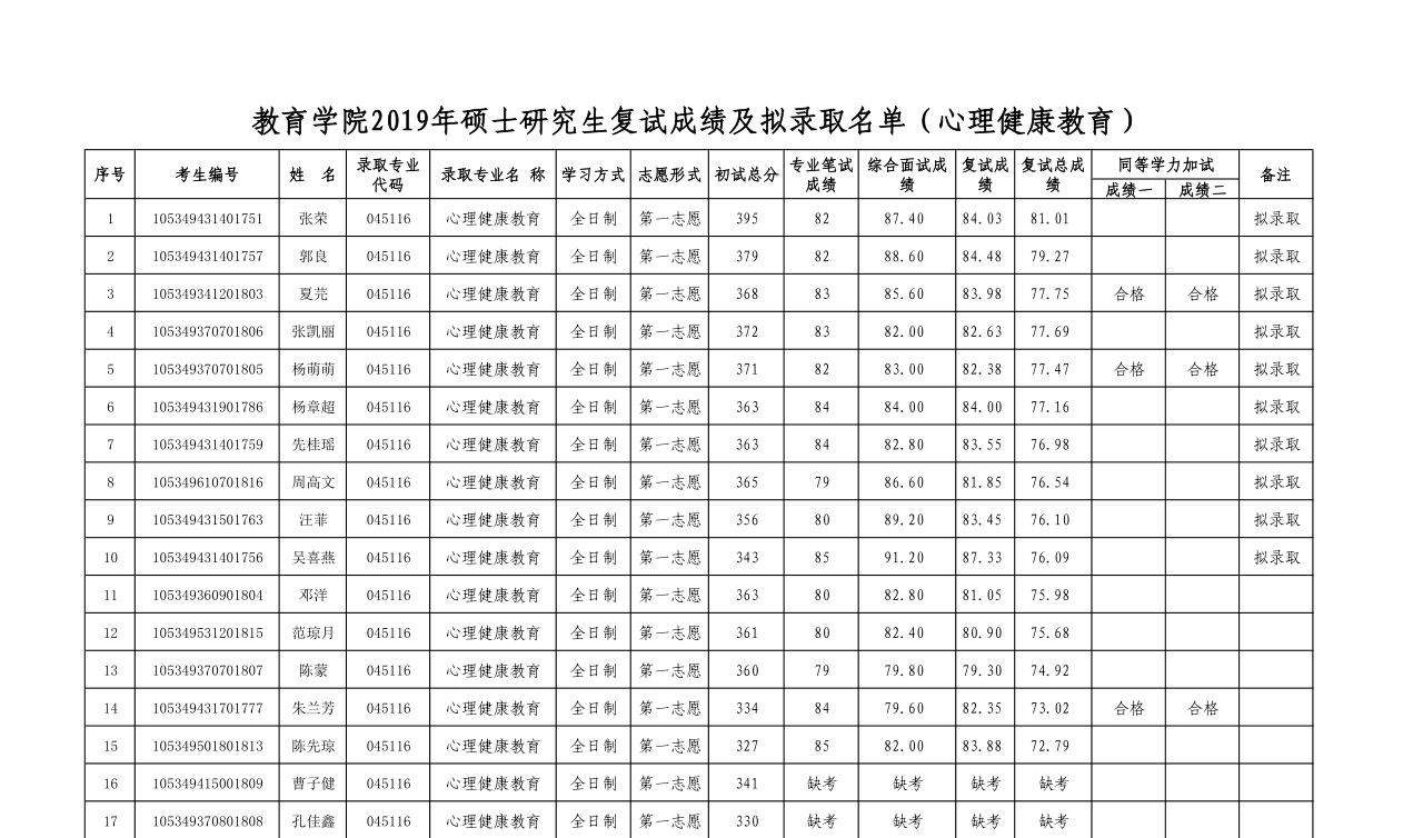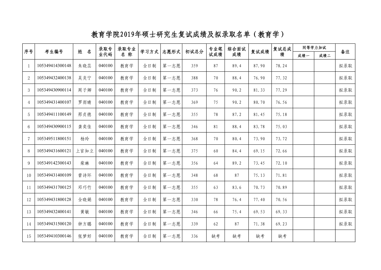 教育学院2019年硕士研究生复试成绩及拟录取名单