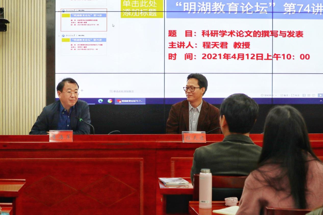 4月12日上午,长江学者、南京师范大学教育科学学院院长、《南京师大学报》执行主编程天君教授做客“明湖教育论坛”,在第八教学楼308学术报告厅为我院师生带来了题为《科研学术论文的撰写与发表》的学术报告。报告由教育学院院长李海萍主持。