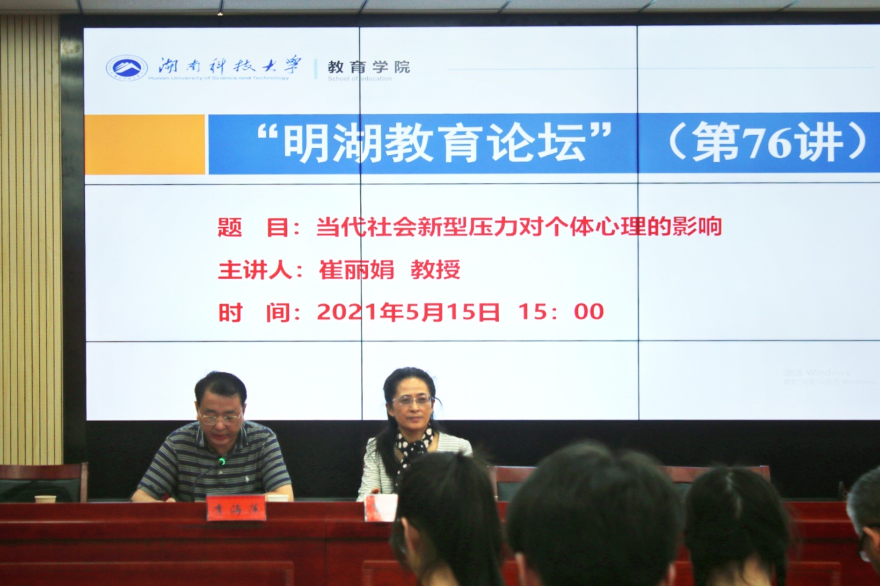 5月15日下午,华东师范大学心理与认知科学学院教授、教育部“新世纪优秀人才支持计划”获得者、中国社会心理学会副会长崔丽娟教授做客“明湖教育论坛”,在第八教学楼308学术报告厅为我院师生带来了题为《当代社会新型压力对个体心理的影响》的学术报告。报告由教育学院院长李海萍主持。