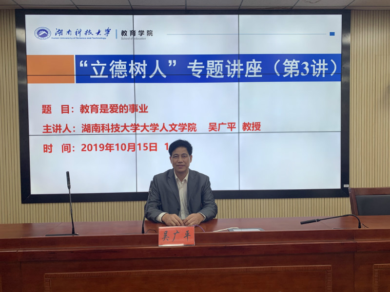 10月15日下午,我校人文学院吴广平教授由“爱”讲起,在八教308学术报告厅开展了“立德树人”专题讲座。讲座由教育学院副院长谭千保主持,教育学院2019级全体研究生和部分本科生共同聆听了此次讲座。