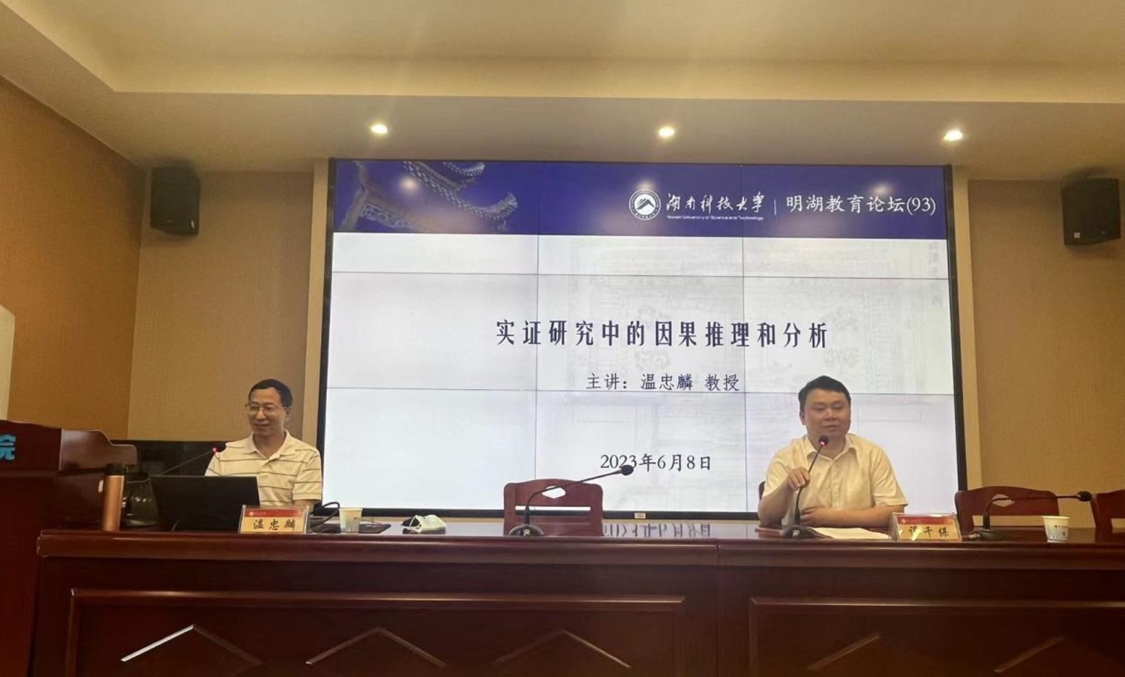 6月8日上午,华南师范大学教授、计量心理学博士生导师,《心理学报》和《心理科学进展》编委温忠麟教授做客“明湖教育论坛”,在敏行楼A333报告厅为我院师生带来题为“实证研究中的因果推理与分析”的学术讲座。讲座由教育学院院长谭千保主持,教育学院教师代表,研究生、本科生到场聆听。