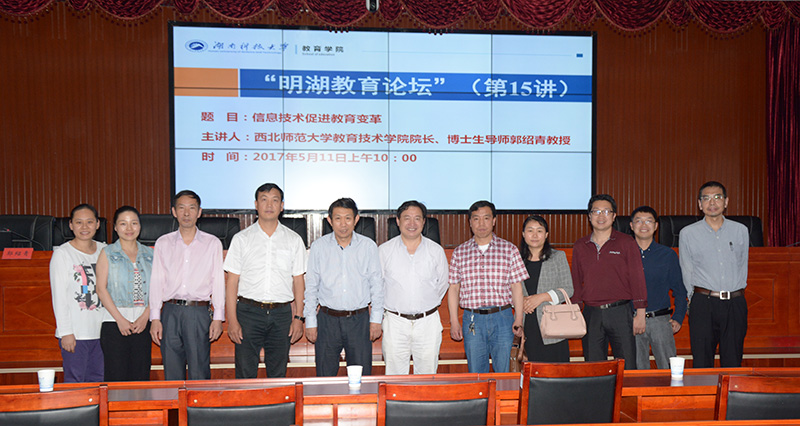 2017年5月11日上午,教育部教育信息化专家组成员,西北师范大学教育技术学院院长,《电化教育研究》杂志主编、社长,博士生导师郭绍青教授应教育学院“明湖教育论坛”邀请,在综合楼五楼报告厅作了题为《信息技术促进教育变革》的学术讲座。教育学院教师代表与研究生代表,教育学、小学教育、教育技术学专业部分本科生到场聆听。报告会由校纪委书记刘宇文主持。