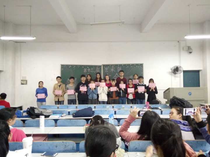 有着科大小春晚之称的教育学院迎新晚会在领导与演员们的共同努力下已圆满落幕,迎新晚会演员们的表演也是亮点频出,为表彰迎新晚会中表现优异者,评选优秀演员和优秀节目,2015年11月4日12:30,教育学院第十三届艺术团成立大会暨迎新晚会表彰大会在第八教学楼1-4教室隆重举行。出席本次会议的嘉宾有教育学院团委学生会主席张彤,第十二届艺术团团长陈姗姗,第十一届艺术团主要负责人以及艺术团各主要成员。