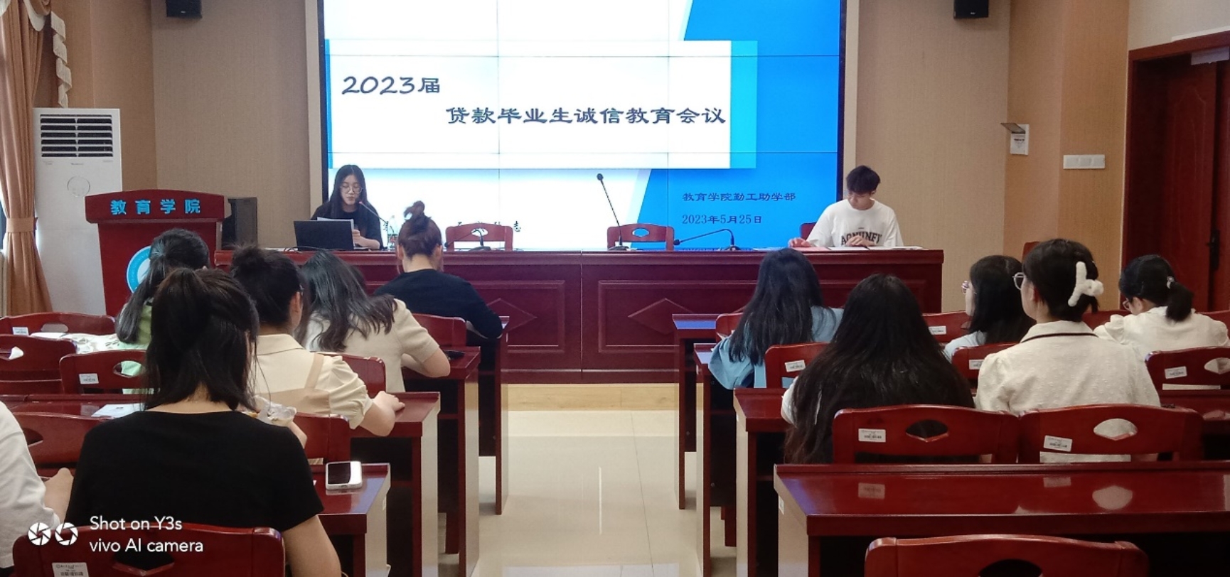 诚信贷款是大学生诚信的具体体现。为进一步优化我院育人环境,净化学生思想,积极营造教育学院“诚信光荣”的良好氛围,帮助贷款毕业生珍惜信用财富,明确个人在国家助学贷款中按约还本付息的责任,及时履行贷款义务, 5月25日,我院组织召开了“教育学院贷款毕业生诚信教育活动”,21级辅导员胡银华出席此次会议,勤工助学部部长杨佳霖、副部长陈露及全体贷款毕业生参加。