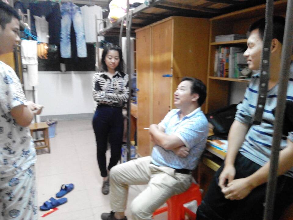 在七区男生寝室,一个教育技术学专业的男寝缺少凳子,上报学校许久却未得到回应,为此,王书记告诉大家要积极落实该事。同时,王书记告诫该寝男生要避免沉迷于网络游戏中,内务卫生也要搞好,大学生要注意个人形象。