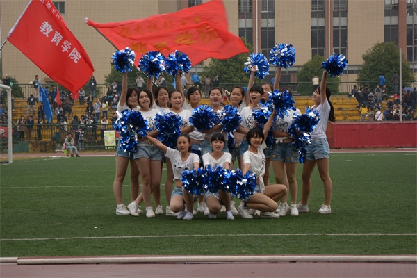 10月31日下午,教育学院啦啦宝贝们来到了运动会现场,白色露脐上衣,浅蓝色牛仔短裤,白色的运动鞋,姑娘们的装束给人以青春活波,热情洋溢的感觉,体现了教育妹子特有的清新靓丽的风格。她们的到来瞬间点燃了观众的热情,教育学院学会主席吴厚涛,团委学生会第一副书记汤思维以及学生会副主席孙绍焜,女生部部长副部一行,举起了教育学院的旗帜,带领啦啦宝贝们走向了绿茵场,在教育学院观众席前表演。伴随着动感的音乐,姑娘们挥舞着蓝银双色的啦啦球开始为大家表演,整齐有力的动作,神采飞扬的笑脸为她们赢得了观众们的一致好评。在观众们“再来一遍!再来一遍!”的呼声中她们又将精彩的舞蹈再现了一遍,观众依然意犹未尽。旁边几个兄弟学院的学生会干部被啦啦宝贝们的精彩表现吸引了过来,极力邀请我们的啦啦宝贝为他们的运动员们加油。我院主席团欣然答应,带着啦啦宝贝们在外国语学院、人文学院、机电工程学院、能源学院、法学院等学院进行了表演,各学院纷纷将学院旗举来为啦啦宝贝们造势。啦啦宝贝们“教育外院,友谊长存!教育人文,友谊长存!教育法院,友谊长存!……”的口号响彻天空,各兄弟学院的观众们纷纷呐喊鼓掌,感谢啦啦队的精彩表演。演出结束后,啦啦宝贝们这才回到了教育学院的观众席。