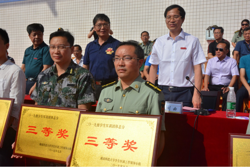 副校长施式亮宣读了2019新生军训表彰决定,并对各个学院荣获团体奖进行现场颁奖。我院荣获2019级新生军训团体三等奖、军容风纪一等奖、内务卫生三等奖、队列会操三等奖、合唱比赛二等奖。