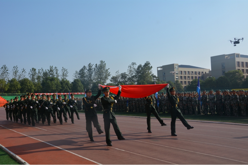 伴随着国歌声响起,五星红旗在风中飘扬,庆国庆、迎校庆,在场新生高声齐呼“祝祖国繁荣昌盛,祝科大越来越好!”紧接着,开始进行军训汇报表演,由军训团教官方阵队打头阵,来自各个学院的方阵队迈着整齐的步伐走向主席台。“名为希望,身似尖钢。看我教院,横扫八荒!”,伴随着响亮的口号声,来自我院方阵队昂首挺胸,步伐坚定,展现出教院学子的恢弘气势。在接下来的拳术表演和战术表演中,身着军装的同学们英姿飒爽,气势如虹,令人叫好连连。