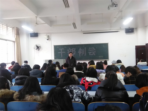 而后,王书记强调了开学学生到校的问题,要求各班班长、团支书清点本班到校人数,了解学生到校动态,及时将本班同学的到校情况反馈学院。王书记说道,由于今年开学较晚,距离5月份学生会换届只有两个月的时间,学生会各部门都有责任、有义务做好部门接班人的培养工作。最后,王书记强调了学院的学风清理,要求学生干部关注有挂科科目的学生的不考动态,尤其是要调查挂科严重的学生的动态,究竟是什么原因导致这种状况。