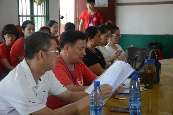 早8时全员整装集合合影,于11时抵达锁石中学,双方简单会晤后进行交接座谈,汇报室内锁石镇中心学校校长赵江伟进行合作方代表发言,对于13日至16日的前期相关工作校方安排和四名班主任队伍安排进行说明,锁石镇主抓教育党委贺小虎、锁石中学校长王金贤、安全副校长彭格全、本部教导主任王志鹏、政教主任李辉和相关从教教师参与座谈。王伟清教授对本次活动志愿群体依次进行介绍,强调本次“夏令营”形式的心灵呵护活动的教育首发性,覆盖当地政府和执行方教师队伍的责任落实,务实开展,深入研究被试群体心灵健康与品行发展问题。技术总监陈婷对后续四天活动进行安排说明,会议重点强调安全问题。