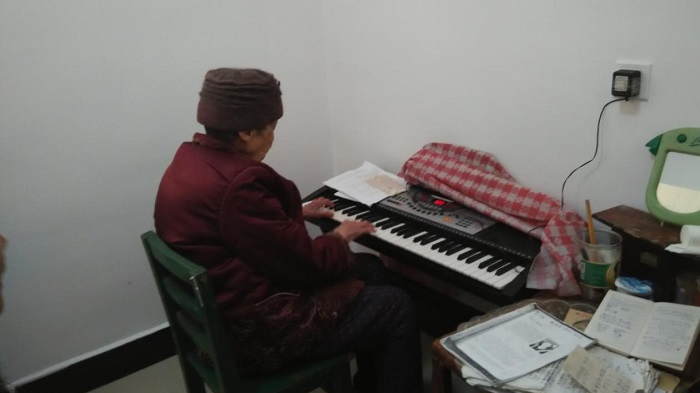 “你们想听什么歌?”三楼接近入口处的一间房内,一位95岁老人刘翼文让志愿者在她摘抄的字迹清秀的歌词本上选歌,合着她轻快地指尖带来的电子琴乐曲,愉快的歌声响起。据悉刘奶奶退休于曾经的金陵女子学院,曾任体育老师,教过体育、英语、音乐。