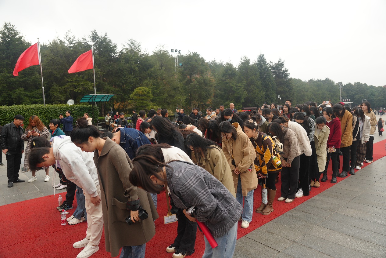 毛主席铜像巍峨挺拔,双目炯炯。全体成员整齐列队,整理着装,对着铜像行鞠躬礼。鞠躬礼完毕,全体成员绕铜像一圈,瞻仰毛主席,表达深切怀念之情。