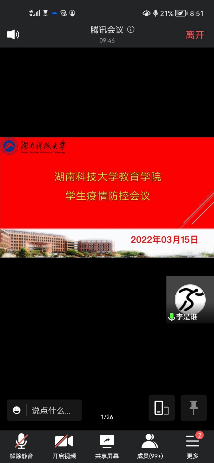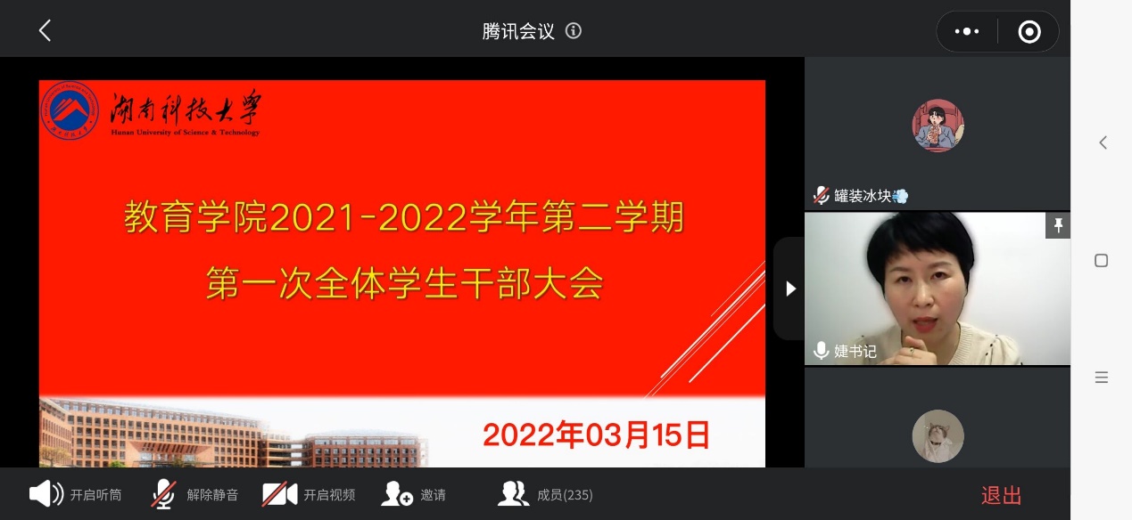 近日,疫情形式严峻,为筑牢校园防控屏障,保障我院学生的健康安全,教育学院于3月15日晚20:45采用线上会议的形式,召开了学生疫情防控会议暨2021-2022第二学期第一次全体学生干部大会。我院党委副书记刘婕出席会议,200余名本科生、研究生学生干部参加。会议由学工办主任李涛主持。