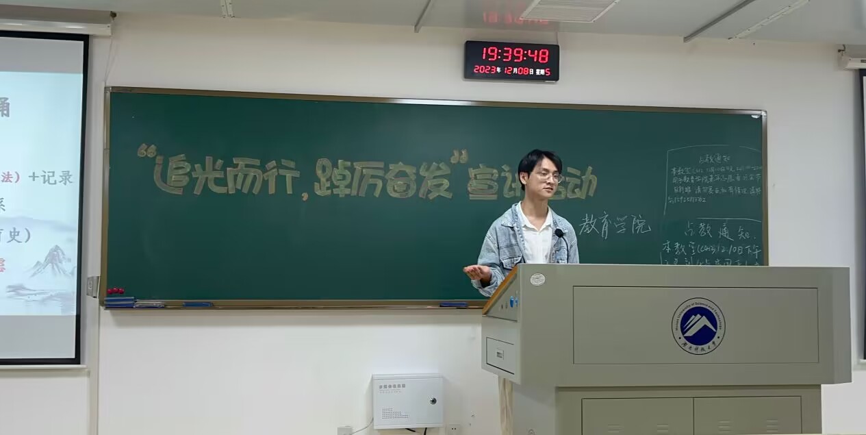 为了充分发挥国家奖学金获奖者的榜样引领和朋辈示范作用,鼓励广大学生德、智、体、美、劳全面发展,形成勤奋学习、努力进取的良好学风,12月8日,在敏行楼C412,教育学院举行“追光而行 踔厉奋发”国家奖学金获得者宣讲会。20级小学教育一班汪永健同学担任本次活动宣讲嘉宾。