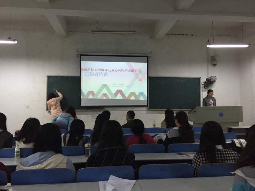 2016年4月8日晚19时,湖南科技大学留守儿童心灵呵护志愿团第二次志愿者主题培训于八教1-6固时开讲,志愿团主要干部和志愿者皆数到场,技术副总监谢佳琼作为培训主讲人针对助手、观察员分类职能进行具体培训说明。