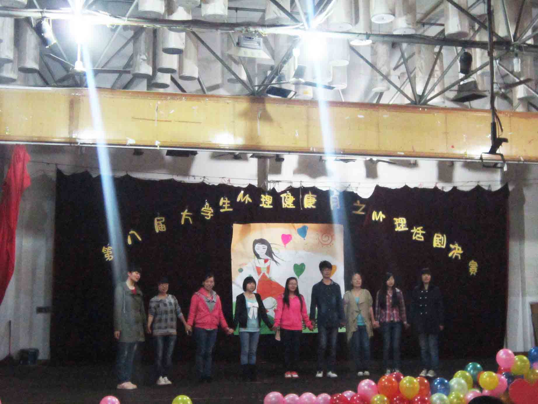 释放心灵,展现自我。在主持人的开场白后,比赛精彩开始。第一个出场的是由12小教3班带来的《心路》,其主题凸显了当今一些大学生嫌贫爱富、攀比、脆弱的心理问题,他们的表演拨动了观众们的心弦,赢得了观众的阵阵喝彩,将赛场的气氛推向了高点。接着由12小教1班出演了《成长》,在压抑的音乐声中,成功的演绎了一个屡屡受挫,心灰意冷之下准备结束生命之时,在身边同学的感化下,最终放弃轻生的念头,重拾信心勇敢走下去的大学生形象。应心3班和应心1班表演的《一直都在》和《眼前阴影,身后阳光》,《一直都在》讲述了一个创业者在一起创业的朋友与女友的不解的双重打击下,内心善良与邪恶展开了一场生死之间的较量。《眼前阴影,身后阳光》演绎的则是一个豁达的独臂画家为离家出走的学生、失意的老总解惑的故事。