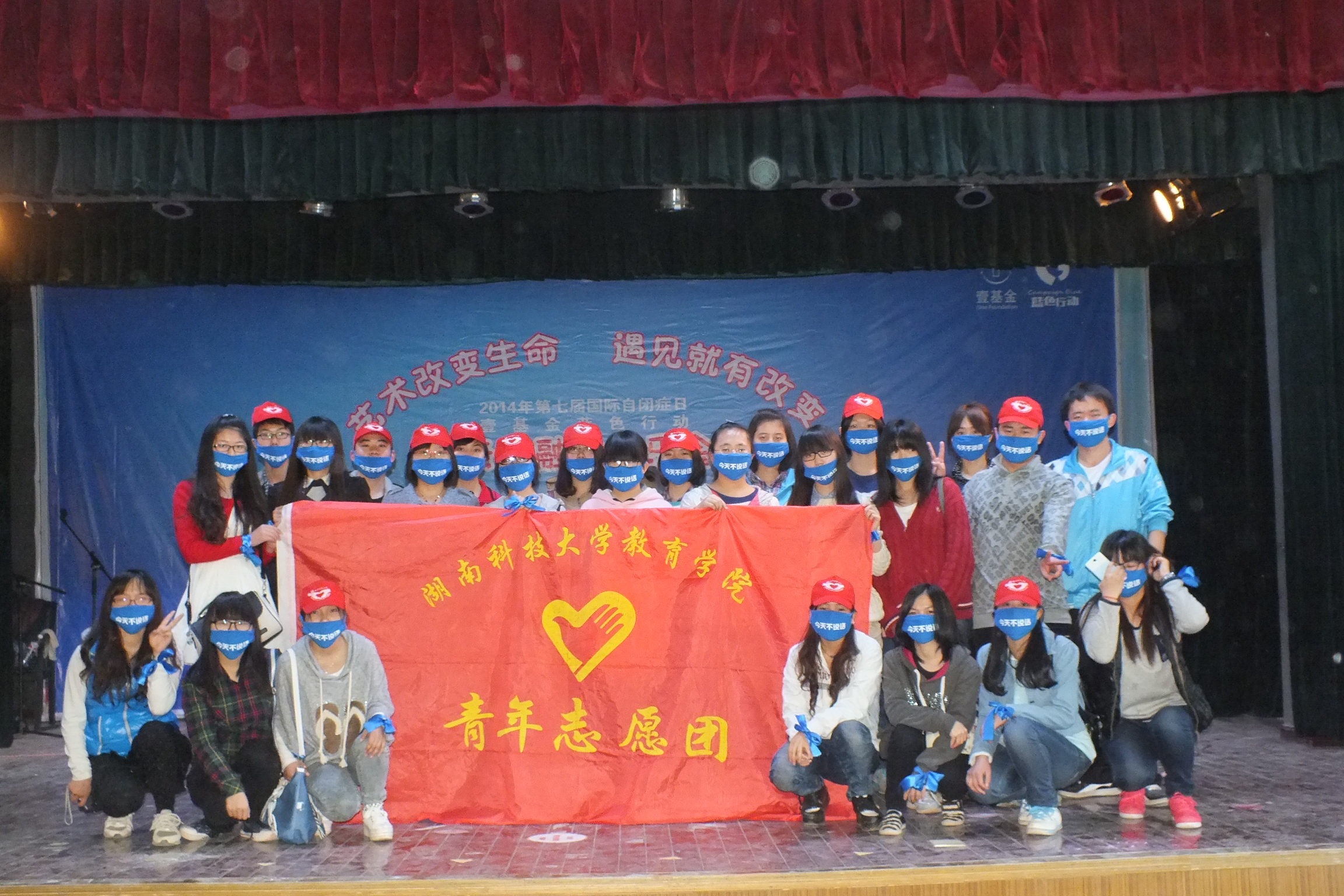 “世界那么大,只要我们心在一起,爱会让每个角落发光。”为了加强社会各界对自闭症儿童的关怀,4月1日,湘潭市岳塘区亲园培智学校、亲园残疾人托养中心、大福基金以及壹基金在湘潭市少年宫举办了“艺术改变生命,遇见就有改变”的亲园融合音乐会。也为2014年4月2日——第七届国际自闭症日拉开帷幕,我院青年志愿团和校心健朋辈组应邀加入志愿者团队。