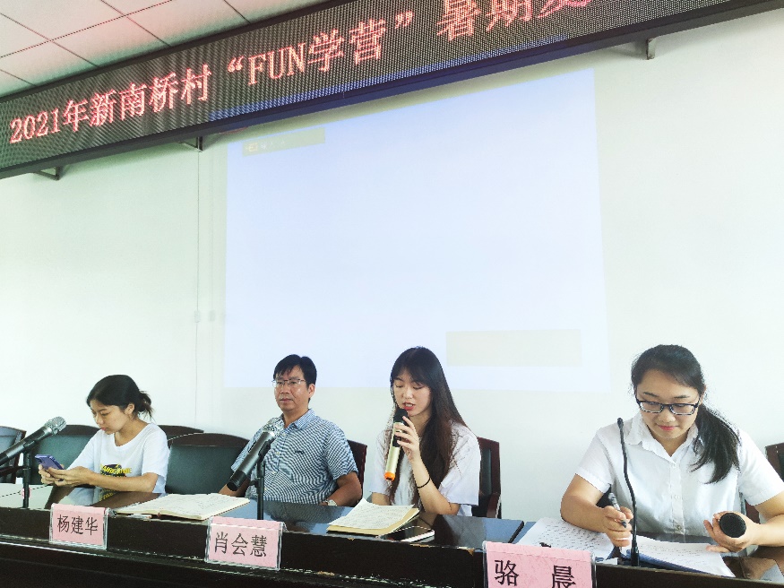 7月13日八时,湖南太阳成集团tyc122cc入口木槿感恩支教团赴新南桥村“Fun学营”暑期开营仪式在新南桥村村委会二楼会议室举行。大会由新南桥村支委委员骆晨主持,新南桥村党总支第一书记杨建华、党总支副书记周慧、木槿感恩支教团教员、“Fun学营”全体学生及部分家长出席本次会议。