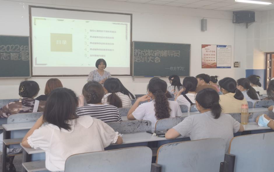 为更好的关注新生心理健康,帮助新生解决心理困惑及问题,建立起完备的养成辅导员心理工作体系,9月13日16:30,教育学院在第八教学楼2-3教室开展了“助我成长”系列讲座第八十五讲-养成辅导员心理工作体系与指导培训。本次培训由辅导员练素华主讲,全体养成辅导员到场参加。