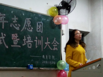 最后,学工办练素华老师最后做总结。志愿团的志愿者要有满满的热情,暖暖的爱意。对教育学院青年志愿团最诚挚的感谢,对新成员最衷心的问候,对兄弟青年志愿团致以最热烈的欢迎。对于青年志愿团要携手前进,勇于面对压力,困难。要以百倍的信心和勇气,以严谨的态度,秉承着“我奉献,我快乐”的精神,创造出青年志愿者的辉煌。
