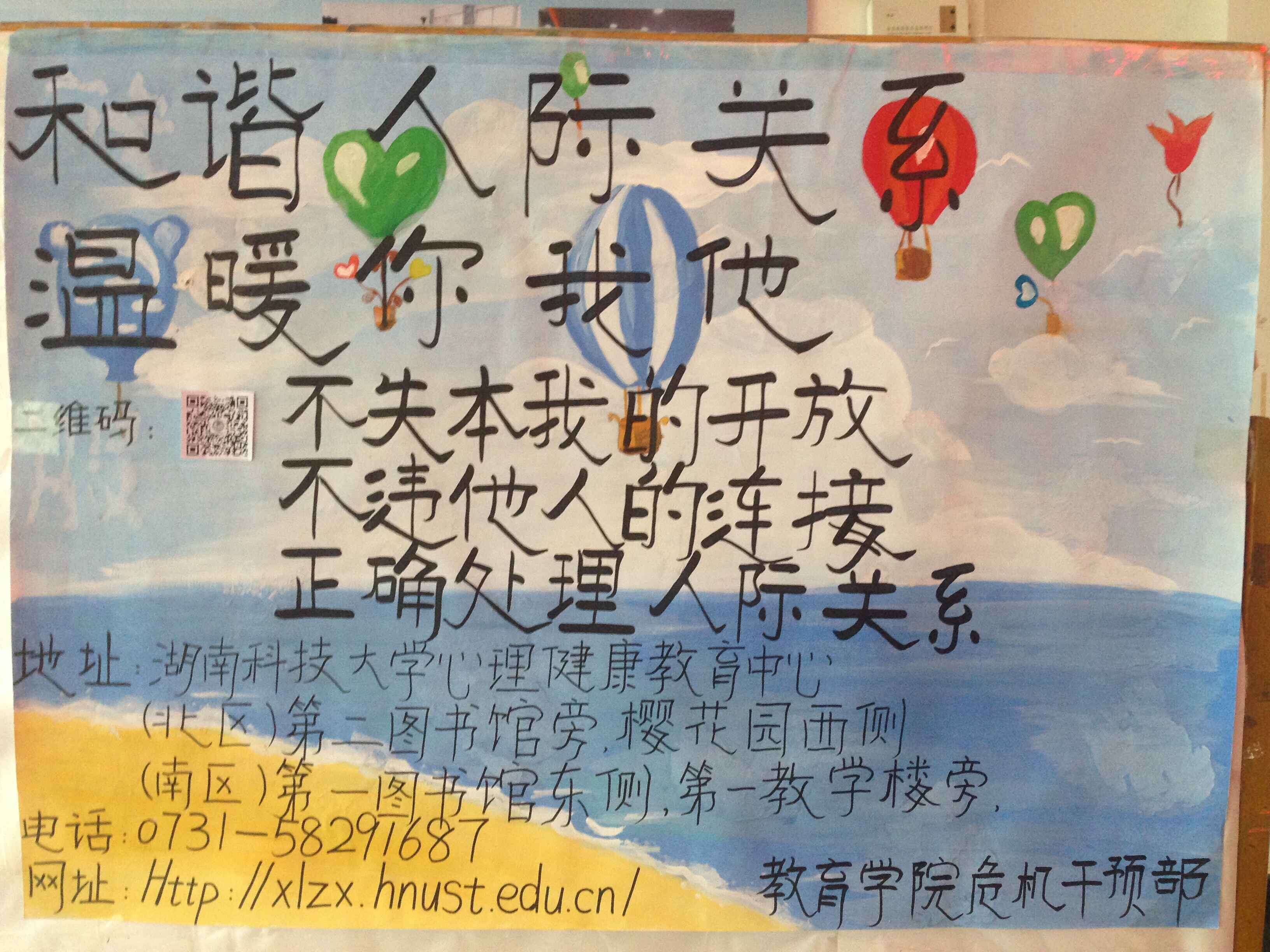 搞好人际关系是一门艺术。所有的人都需要不断的学习和实践、才能臻于娴熟。希望您能根据自己的具体情况,作一个自我分析 ,从而冲破自我封闭的篱笆,虚怀若谷,去建立一个和谐的人际关系。 教育学院危机干预部“和谐人际关系讲座”