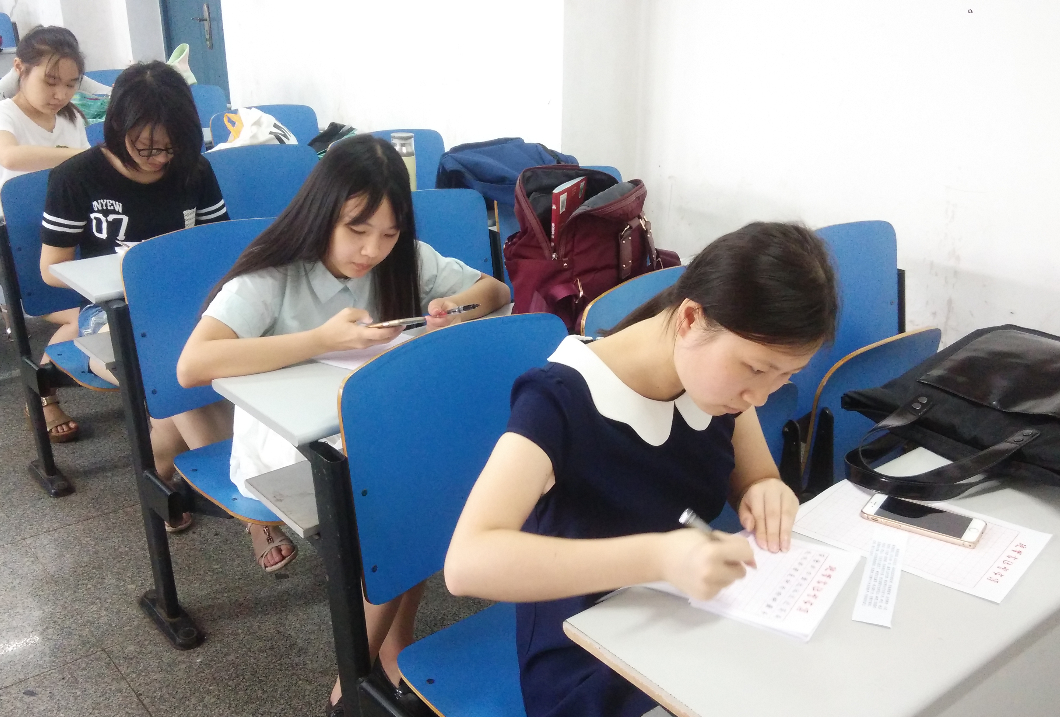 比赛开始后,粉笔字组的同学在自己的小黑板上很认真的写着“随风潜入夜,润物细无声。”这一句古诗,写完了还在不断的修改。毛笔字组的同学纷纷站起来挥笔撒墨,颇有大家风范。钢笔字组的同学每个人誊写一段话,同学们一个个都紧握着钢笔,眉宇间微皱,生怕写的不满意。经过傅定涛老师的最终评分,粉笔字获奖的同学有胡倩倩、章瑜、詹梦珍、杜洁、宋丽丽。毛笔字获奖的同学有马宗宾、冯诗晴、金霞、邵威、张丹、李玲慧。钢笔字获奖的同学有刘敏、贾红、严幸。