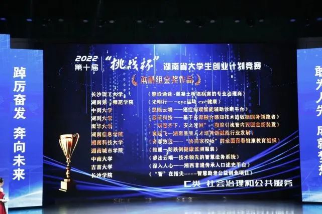 2022年6月10日,湖南省第十届“挑战杯”大学生创业计划竞赛终审决赛发布会于长沙学院举行。我院19级应用心理学二班汤敢(项目负责人)、19级教育学一班康玉婷(项目成员)、19级应用心理学一班张静丹(项目成员)同学所参与的项目《青春致远——“协同家校社”的全面青春健康教育组织》斩获大赛金奖,实现我院在该奖项的突破,再创新高!