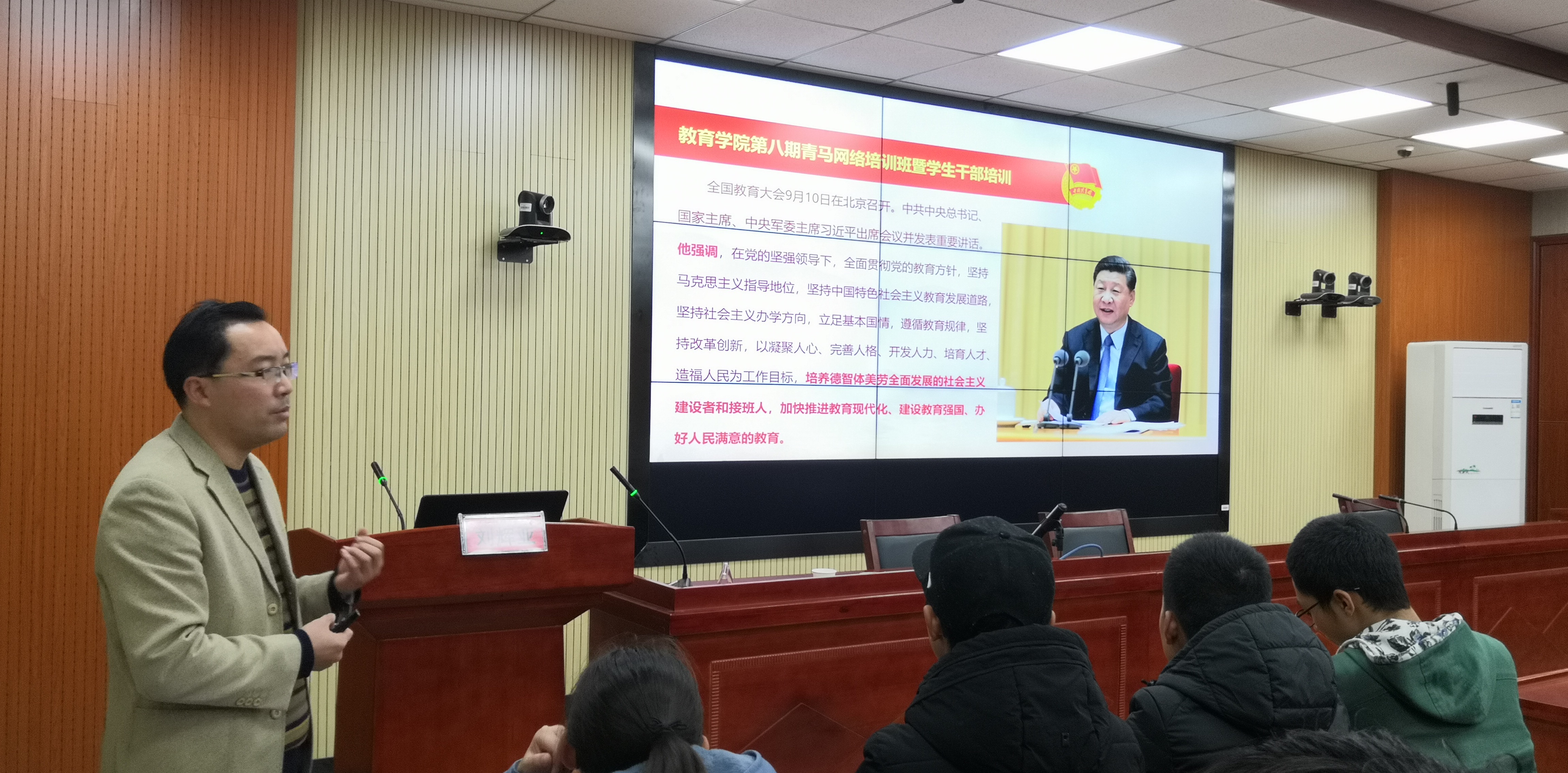 2018年12月4日16:20,我院在第八教学楼308会议室开展以“纪念毛泽东诞辰”和“传达全国教育大会精神”为主题的第八期青马网络班培训暨学生干部培训大会,由教育学院党委副书记刘辉亚以及团委书记练素华老师主讲,所有青马网络班学员参加。