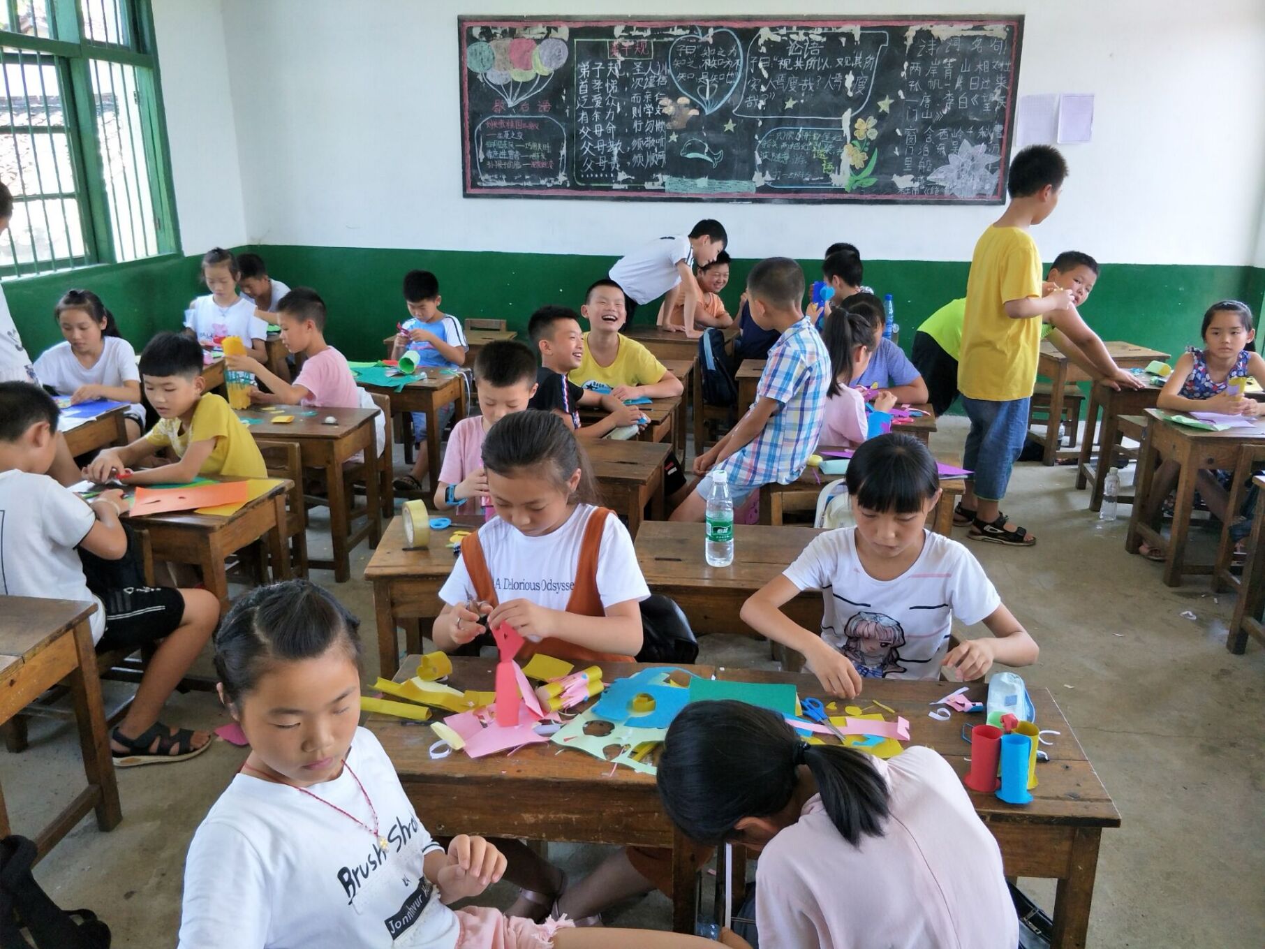 7月14号,教员们开始第一天的支教。早上8:00,教员们满怀期待的来到教室。因为年级不同,且暑期支教更重要的应该是开阔视野。所以上午的课堂教学有手工、书法、心理健康、历史、舞蹈、英语和消费。“小朋友们做手工的时候,根本不需要我怎么去指导,他们自己就开始动手了。特别是小学班,他们的剪纸非常有创意,剪的非常棒!”教员张敏这样称赞。下午,分小组进行暑假作业辅导。剩下的时间教员们带着孩子们一起玩。“他们有的跑到另一间教室里开演唱会,还拉着左老师一起去看;有些走到张老师桌旁看她写教案;还有的则缠着老师讲故事。”教员唐团全如是说。短短几天,却已经如此熟悉。