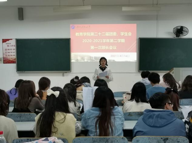 为了进一步提高学生会组织建设,加强各部门之间的联系,提升学生会工作效率,教育学院于4月16日下午17:20在第八教学楼3-4教室召开了第二学期团委学生会第一次部长会议。教育学院第二十二届团委学生会主席团成员及各部门部长参加会议。
