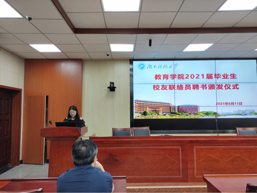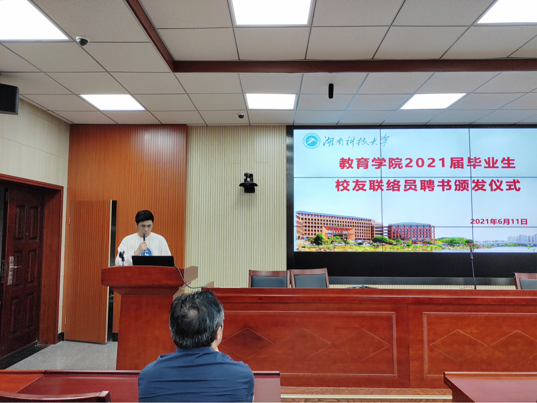 为进一步加强校友联络、增进校友情谊、帮助校友发展,6月11日下午15:30,教育学院2021届毕业生校友联络员聘书颁发仪式于第八教学楼308会议室举行。颁发仪式由教育学院辅导员胡银华主持,教育学院党委副书记刘辉亚出席本次仪式。