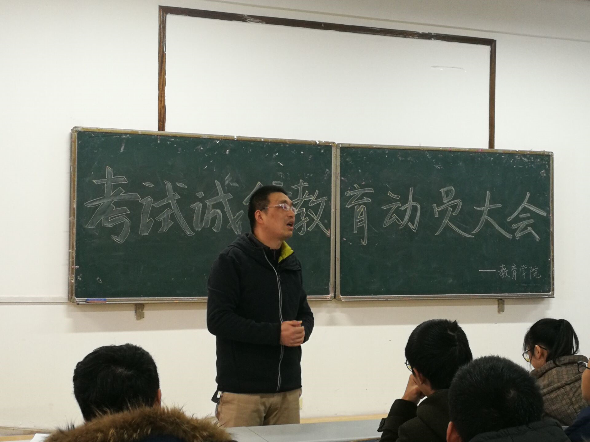 2018年12月14日下午15:30,在八教3-3召开了了考试诚信教育动员大会,此次会议由教育学院宿舍管理部主办,旨在贯彻学院学风建设,督促学生顺利通过考试,严肃学院考风考纪。届时党委副书记刘辉亚,学生工作办公室主任李涛,学生会主席姚中强,团委第一副书记李雪,团委第二副书记张临峰,学生会副主席曾根凤共同参加了本次会议,此次大会主要参会人员为15-18级各班班长,团支书,寝室长。