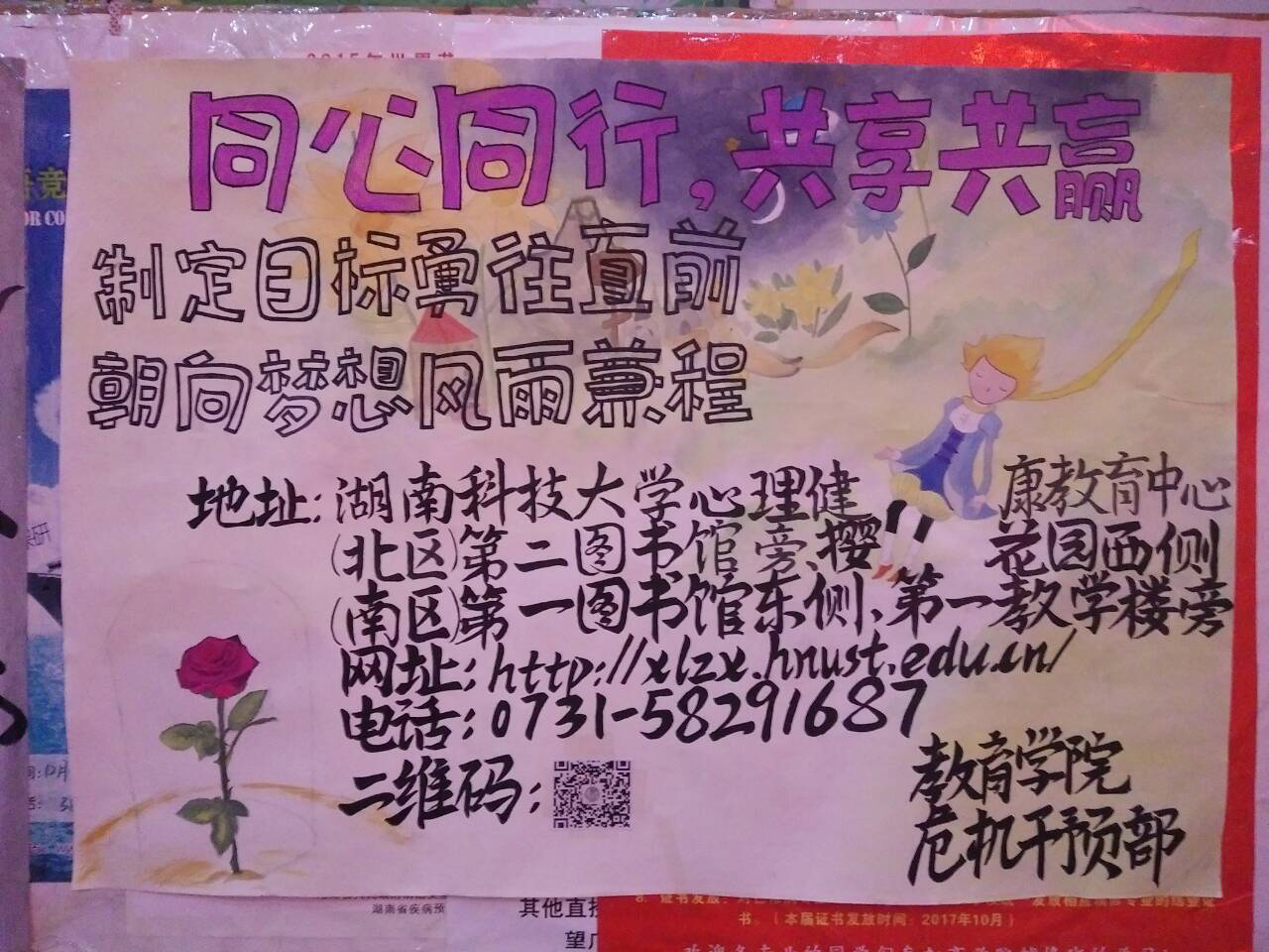 您所在的位置: 首页» 学生工作» 日常管理 同心同行,共享共赢 时间:2016-03-16 00:00:00 人只有足够自信和自爱,才能有勇气和精气神让自己活得更精彩,而活得精彩,又将增添更多自信和自爱。做好对未来的规划,并付出实践,带来的充实感和满足感,就是精彩。 校心理健康中心网址: http://xlzx.hnust.edu.cn/