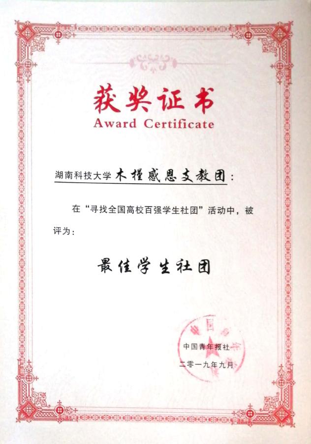木槿感恩支教团公益事迹多次被国家、省级等官方媒体宣传报道,先后获评“全国最佳学生社团”(10个)、“全国百强暑期实践团队”“湖南省‘芙蓉学子·榜样力量’公益行动奖”“湖南省百优社团”“湖南省三下乡重点服务团队”等;社员刘柯、高任连先后获“全国‘挑战杯’二等奖、三等奖”“全国‘挑战杯’累进创新奖”铜奖、吴玉容获“湖南省十大教育新闻人物”、 张敏获“芙蓉学子?榜样力量优秀大学生”等。
