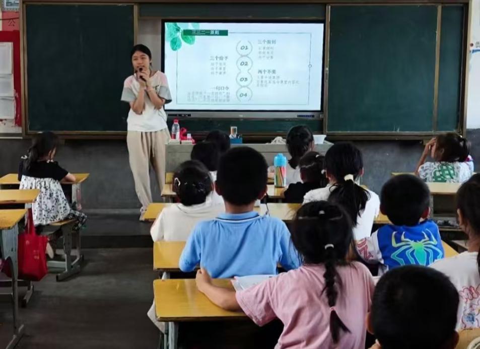 “一流班级!”“静悄悄!”随着清脆的应答声,孩子们迅速坐直身体,眼中闪烁着期待——这是支教团独创的课堂“三三二一”规则在发挥作用。这套简洁明了的规则(三个做到:认真倾听、积极参与、乐于分享;三个给予:微笑、尊重、掌声;两个不要:中途离场、玩无关物品)不仅有效维持了课堂秩序,更让孩子们在充满尊重的氛围中敢于表达自我。