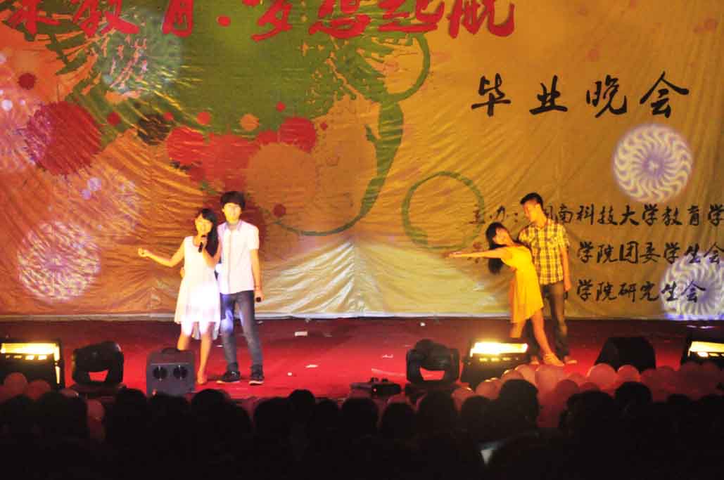 歌曲联唱《四岁青春》提醒我们从宿舍到八教的距离原来只有四年,我们始终都要有勇气奔跑在未来征程上;相声《教育学院那些事》通过面试竞争的方式巧妙地把教育学院四大专业的特色表现出来,告诉我们竞争中也要有合作;原创话剧《致青春》以爱情、友情、“基情”为主线,通过青春的迷茫、苦痛、蜕变、感情纠葛与美好憧憬有力地演绎了青春无悔、大学无悔。