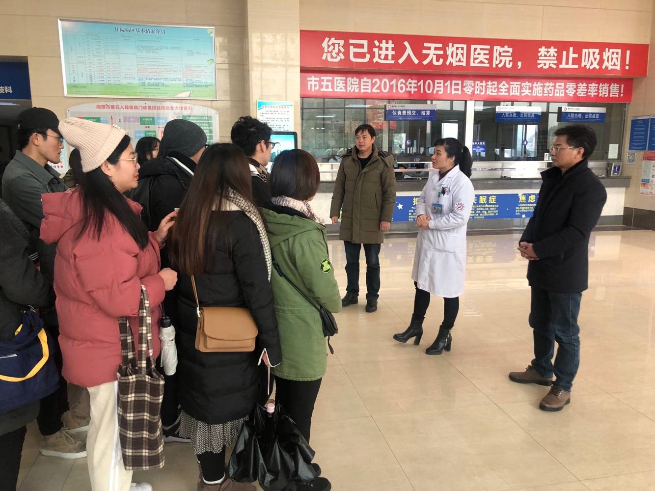 2019年1月2日,2016级心理学系40多位同学在李炳煌、欧阳益老师带领下,赴湘潭市第五人民医院开展实践见习活动。湘潭市第五人民医院精神科王主任为我们介绍了心理科和精神科的基本情况,带领我们参观了门诊以及病房,并就同学们提出的有关问题进行了深入的交流,同学们获益匪浅。李炳煌老师鼓励同学们一定要深入一线实践,理论学习紧密联系实际,学以致用,不断提高自身实践能力。
