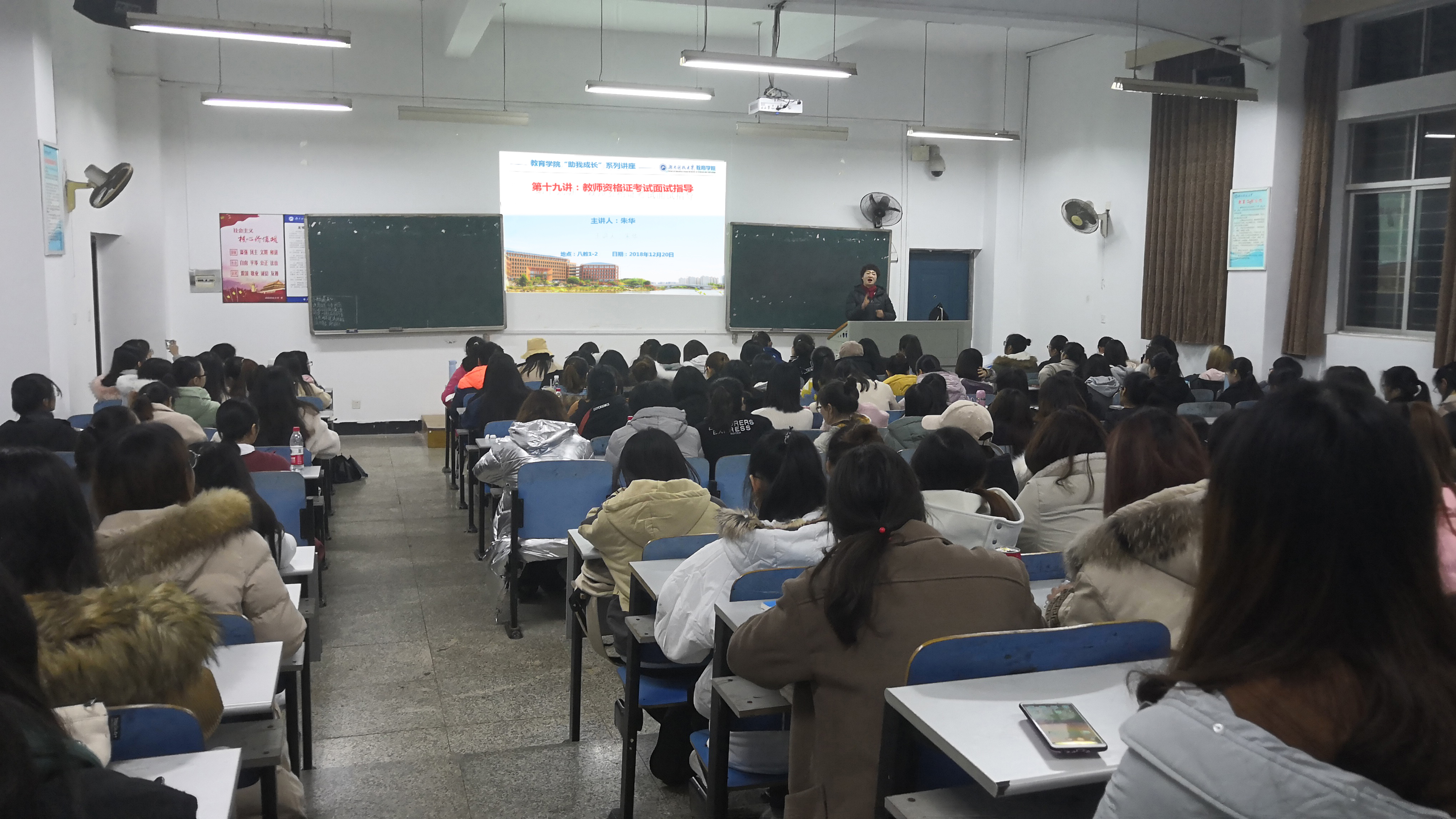 为更好地了解教师资格证面试流程,提升我院学生应试技巧与能力,提高我院学生教师资格证面试通过率,教育学院于2018年12月20日19:00在八教1-2举行“助我成长”系列讲座第十九讲——教师资**面试指导。此次讲座由我院李炳煌老师(湖南省教师资格证面试首席考官)、朱华老师(湖南省教师资格证面试考官)主讲,16级教师资格证笔试通过的全体学生参加。