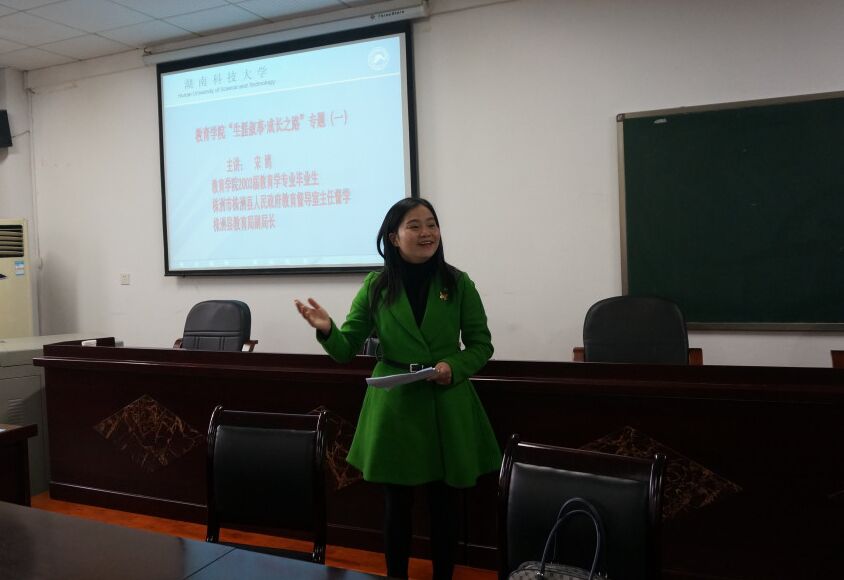 3月21日下午,教育学院首届本科毕业生,株洲市株洲县人民政府教育督导室主任督学、株洲县教育局副局长宋鸥应邀回母校讲座。活动由教育学院教育系夏永庚博士主持,党委副书记王伟清教授详细介绍了宋鸥的成长经历,教育学院教育学专业本科生、部分研究生代表参加了活动。