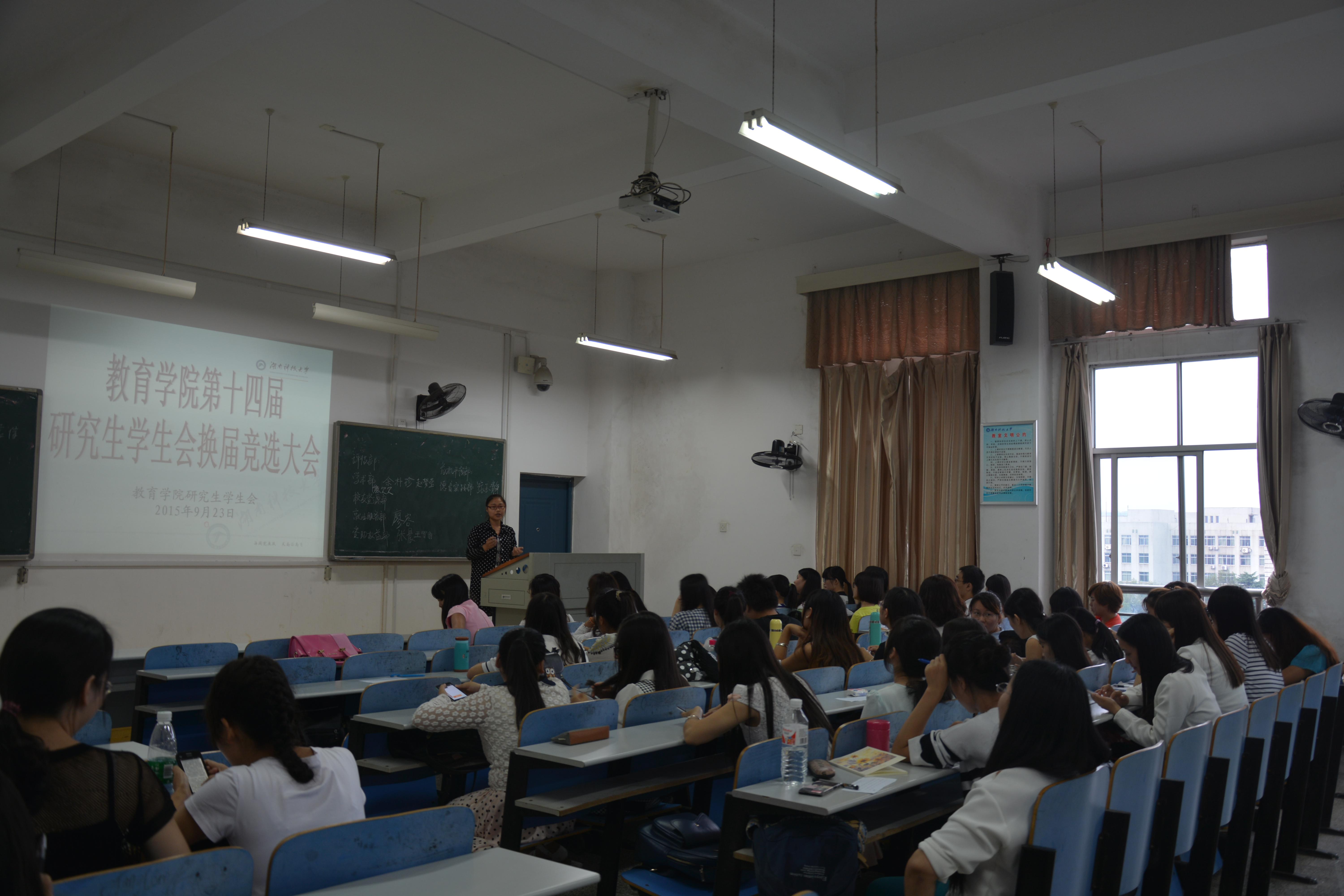 2015年9月23号16:30,湖南太阳成集团tyc122cc入口第十四届研究生学生会在八教4-4举办了换届竞选大会。教育学院党委副书记王伟清教授、研究生辅导员滕茜茜老师出席此次会议,参会的还有第十三届研究生会的主席团成员、相关部门部长、副部长以及2015级全体研究生。本次大会由第十三届研究生会主席李艳玲主持。